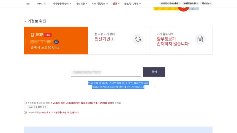 확정기변 확정기변은 유심기변과 큰 차이 없이 동일하지만, 매우 중요한 차이점은 새롭게 변경할 기기(중고기기 포함)의 소유권을 등록하는 것으로 이해하시면 됩니다.유심기변과 확정기변의 차이가 기기의 소유권 등록으로 인해 기기 분실이나 도난으로 인한 피해를 최소화하기 위함이므로 특별한 경우가 아니라면 반드시 권장합니다.확정기변으로 기기 소유권이 등록된 경우 분실이나 도난 시 아래에 표시한 ‘휴대폰 단말기 자급제’ 웹사이트에서 조회가 가능합니다.