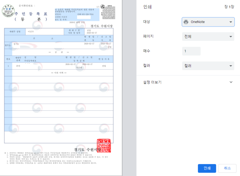 주민등록등본을 발급받으려면 주민등록상 주소를 입력해야 합니다. [시행 선택] 와 [시군구 선택] 를 클릭하여 주소를 입력합니다.주소지를 입력하고 아래로 내려가면 발급 형태와 수령 형태를 선택할 수 있습니다.① 발행 형태를 선택합니다. [선택발급]의 경우 필요한 정보에 따라 과거 주소변동사항, 세대정보, 주민등록번호 아래 4자리 등 등본에 표시할 정보를 선택할 수 있습니다. ② 온라인 발행(본인 출력)을 선택합니다. 자택에서 인쇄하거나 본인이 필요한 경우는 온라인 발행(본인 출력)을 선택합니다.③ [민원 신청] 를 클릭합니다.그 후 간이인증이나 공동, 금융인증서를 통한 인증이 필요합니다. 저는 [간편인증] 방법을 선택했습니다.간편인증은 삼성패스, 카카오톡, 네이버 등 주요 인증서를 모두 사용하실 수 있으니 편한 방법을 선택하세요.인증절차가 끝나면 정부24 홈페이지 서비스 신청내역에 [처리완료]상태로 되어 있는 것을 볼 수 있습니다. [문서 출력] 를 클릭합니다.주민등록등본 출력위에서 [문서 출력]을 누르면 다음과 같이 발급된 주민등록등본이 표시됩니다. 우측 상단의 인쇄 아이콘을 클릭합니다.인쇄 버튼을 누르면 인쇄를 위한 화면이 표시됩니다. 인쇄할 프린터를 선택해 인쇄 설정을 한 후, 이하의 인쇄 버튼을 누릅니다.주민등록등본PDF파일로저장상기의 인쇄 화면에서 PDF파일로 저장할 수 있습니다.PDF로 저장 해놓고 나중에 인쇄하려는 경우나 파일이 필요한 경우는 PDF파일로 저장하는 기능을 이용할 수 있습니다.PDF로 저장-저장을 클릭하고 컴퓨터 내의 저장 위치를 선택하면 주민 등록 등본이 보존됩니다.비회원에서도 손쉽게 집에서 인터넷으로 서류를 발행할 수 있다는 것은 큰 장점이라고 생각합니다.정부 24사이트에서는 주민 등록 등본만 아니라 주민 등록 초본, 가족 관계 증명서, 소득 금액 증명, 건강 보험 자격 득실 확인, 운전 경력 증명, 사업자 등록 증명, 대학 졸업 증명서 등 일상 생활에 필요한 다양한 증명서를 인터넷에서 발행할 수 있기 때문에 정부 24를 적극 활용하면 시간도 돈도 절약 된답니다.인터넷 강국 대한민국 정부 만세!