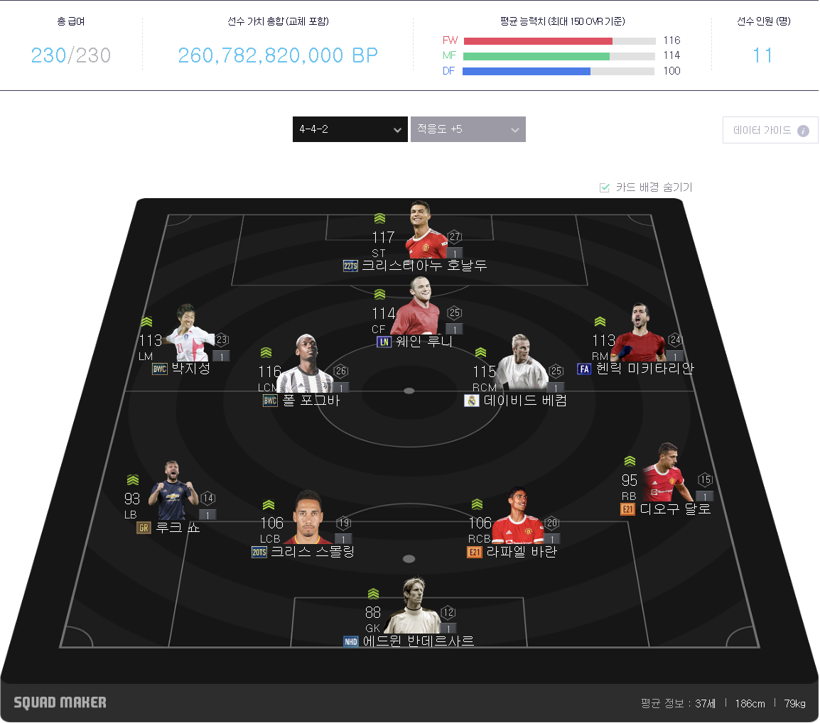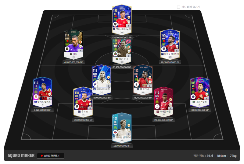 콤미가 적합한 포지션이지만 중반에 배치하면서 게임 전체적인 흐름상 키 플레이어로 활용해 주었습니다.수비력도 뛰어나기 때문에 볼란치로도 활용할 수 있는 자원입니다.중거리 슛과 패스력이 좋아서 중원에서 뿌려주는 침투 패스가 좋습니다.가속력이 129.. 미드필더 선수치고는 빠른 편이라 순간적인 돌파도 은근히 위협적입니다.중거리 슛이 좋기 때문에 기회가 생기면 바로 치면 아주 잘 되었습니다.킬력이 정말 좋은 선수였어요!오른쪽 미드필더로 마커스 래쉬포드의 바로판매기능으로 최근 시세가 매우 상승중입니다.. 700억정도에 샀는데 지금 1조400억이네요.. 주력이 빠르고 위치결정과 슛능력이 높아 위협적으로 측면 돌파가 좋습니다 키가 큰 편이라 공중볼 경합이 좋은 선수입니다. 공격 자원으로 스트라이커로 활용해도 좋지만 개인적으로 래쉬포드는 윙어 포지션이 훨씬 잘 어울리는 선수인 것 같아요.수비형 원볼란치의 미드필더, 맥토미니입니다 태클, 몸싸움, 체력이 높아 수비에 큰 도움이 됩니다. 중거리슛도 은근히 잘 들어가 있어서 위협적이었습니다 인게임에서 가끔 수미포지션의 선수들이 중거리슛을 때릴 기회가 가끔 있지만 맥토미니 선수는 의외로 잘 들어갑니다 DFFC온라인양 사이드 윙백 수비수 다로와 루크 쇼입니다.주력이 좋고 크로스가 나쁘지 않습니다.윙백 오버랩 전술로 보다 다채롭게 공격 전개할 때 활용하면 다양한 공격 루트가 나올 수 있습니다.일단 맨유 센터백의 특징 중 하나가 속력이 센터백 치고는 너무 높아요… 팀 컬러 정말 좋네요 센터백이 빨리 따라주는 것만으로도 수비 성공률이 올라가는데 가속력이 높기 때문에 센터백마저도 빨라 보였습니다.상대편 입장에서는 빠르게 백업이 되는 센터백을 보면 불공평하다고 느끼는 것 같습니다..발란, 마르티네스를 센터백 포메이션으로 추천합니다. 골키퍼FC온라인곧 더 높은 급여와 시즌으로 교환해 줄 예정입니다.골키퍼는 데헤어 선수로서 팀 컬러를 맞추면서 뽑아줬어요. 4-1-3-2 포메이션은 좀 더 다채롭고 안정적으로 게임을 할 수 있다는 게 좋았어요. 전방에 2명의 스트라이커와 그 뒤를 받치고 있는 3명의 미드필더 선수들로 보다 안정적이고 다양한 공격 전술을 펼칠 수 있었습니다. 한때 유용했던 4-2-2-2 포메이션과 비슷한 느낌이었어요! FC온라인 파이팅 오늘도 찾아주셔서 감사합니다.곧 더 높은 급여와 시즌으로 교환해 줄 예정입니다.골키퍼는 데헤어 선수로서 팀 컬러를 맞추면서 뽑아줬어요. 4-1-3-2 포메이션은 좀 더 다채롭고 안정적으로 게임을 할 수 있다는 게 좋았어요. 전방에 2명의 스트라이커와 그 뒤를 받치고 있는 3명의 미드필더 선수들로 보다 안정적이고 다양한 공격 전술을 펼칠 수 있었습니다. 한때 유용했던 4-2-2-2 포메이션과 비슷한 느낌이었어요! FC온라인 파이팅 오늘도 찾아주셔서 감사합니다.